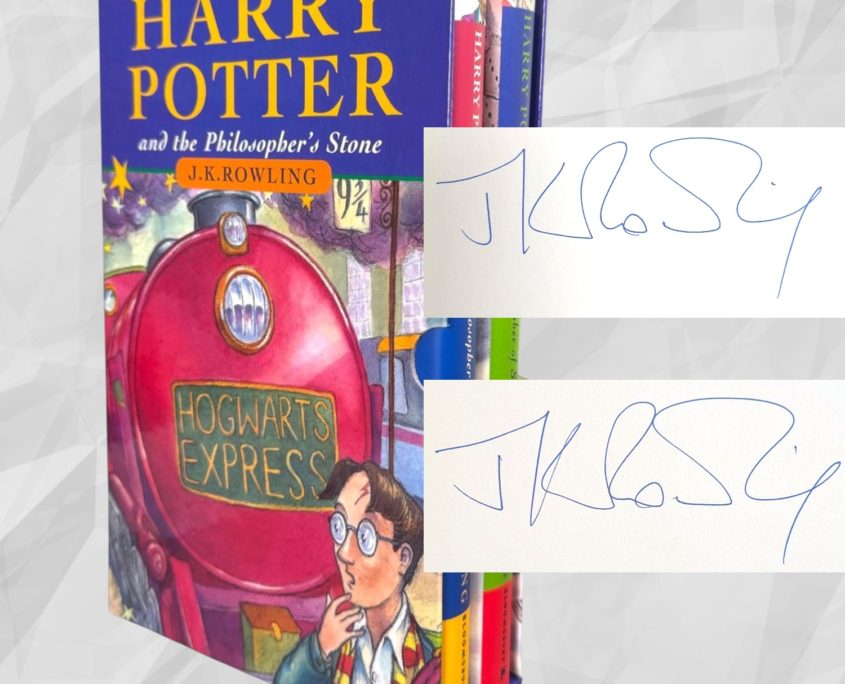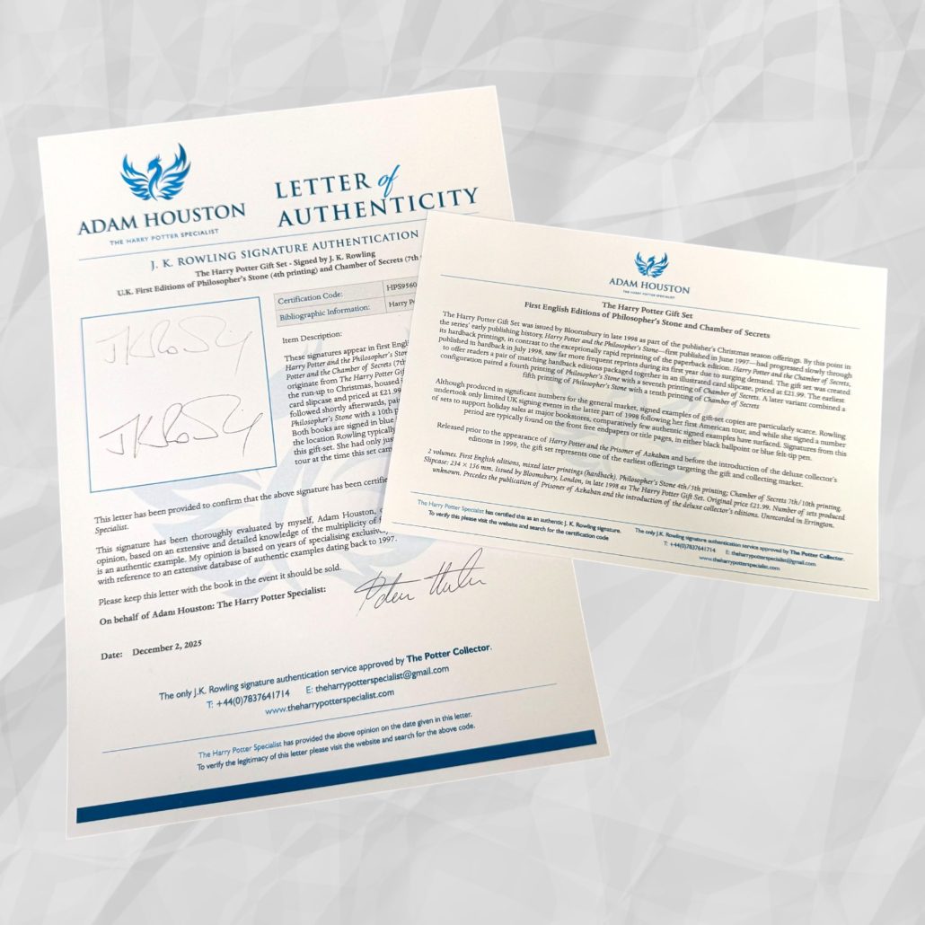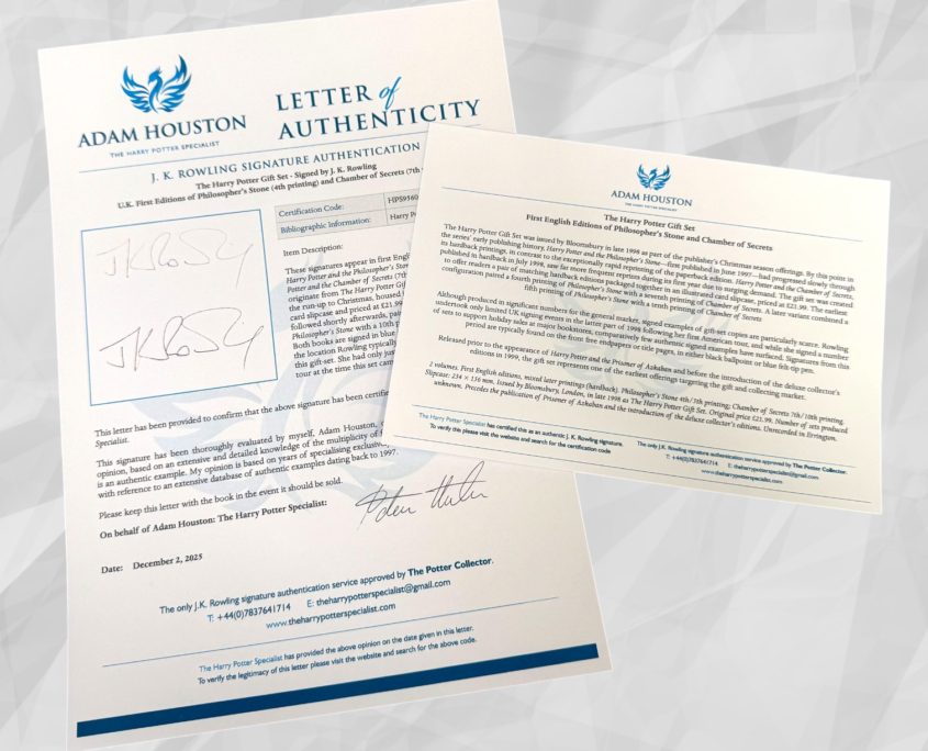 Both signatures have been fully authenticated by Adam Houston, The Harry Potter Specialist, a leading authority on J.K. Rowling’s signature. The set is accompanied by a complete authentication package, including a signed letter of authenticity and collector card.