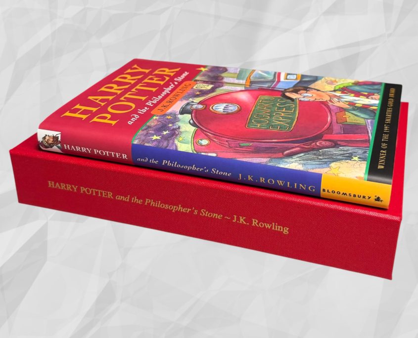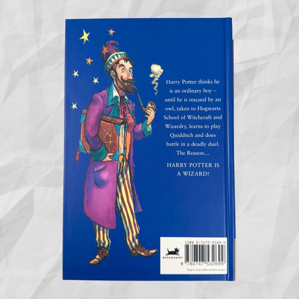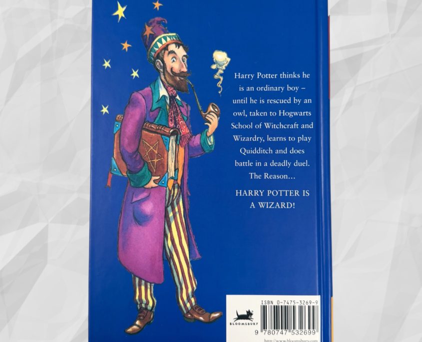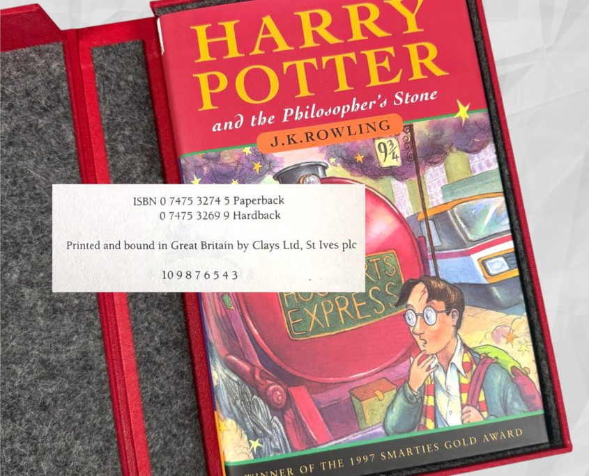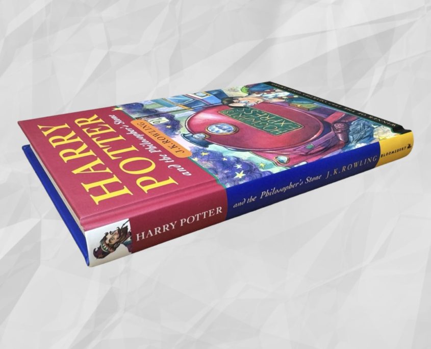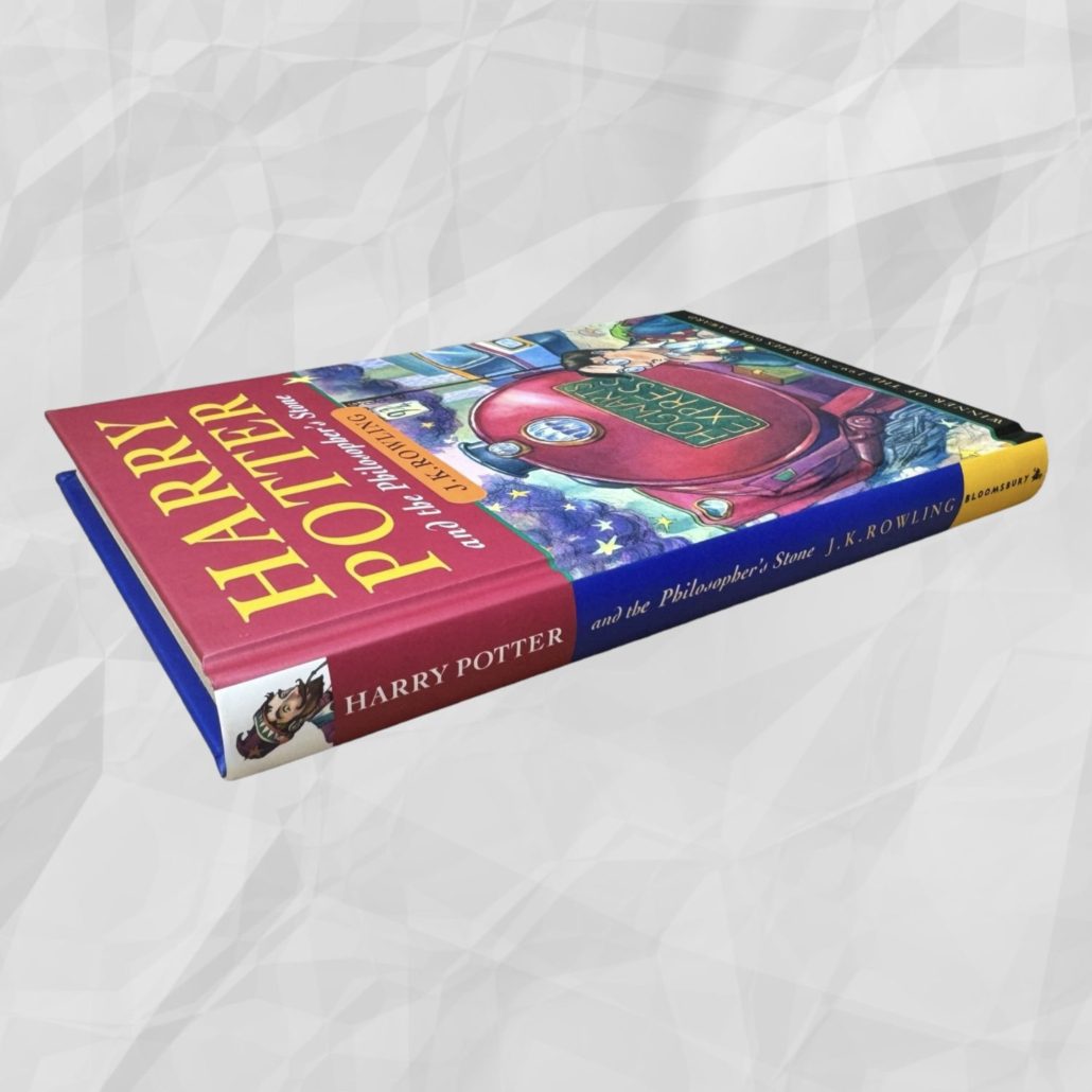 This is a third printing UK copy of Harry Potter and the Philosopher’s Stone. It is a highly sought after copy as it is the first copy to be released with a dust jacket. With the first and second printings often out of reach for the average collector, this more affordable third printing is a great addition to anyones collection. The dust jacket for the third printing is unique in that it is slightly more purple in colour than the blue of the rear board of the book. Subsequent dust jackets on later printings are more of a blue colour matching the blue on the book. Often third printing books are sold with later printing dust jackets as the slight difference in colour is the only thing that can tell them apart. This is a true third printing dust jacket.