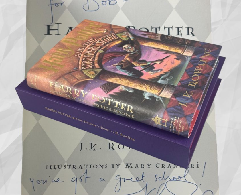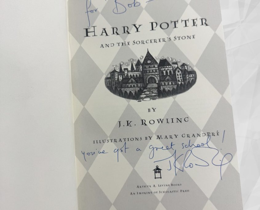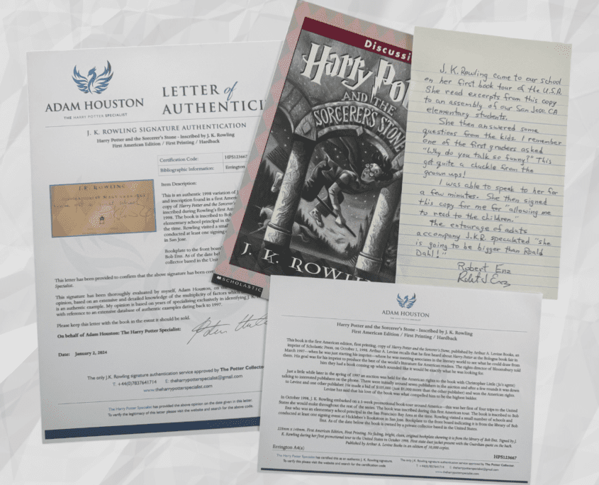 In October 1998, J.K. Rowling embarked on a 3-week promotional book tour around America – this was her first of four trips to the United States she would make throughout the rest of the series. The book was inscribed during the first American tour to Bob Enz who was an elementary school principal in San Jose. J.K. Rowling visited and read at Bob’s school. A hand written note by Bob (included in this sale) details the visit and his meeting with Jo.