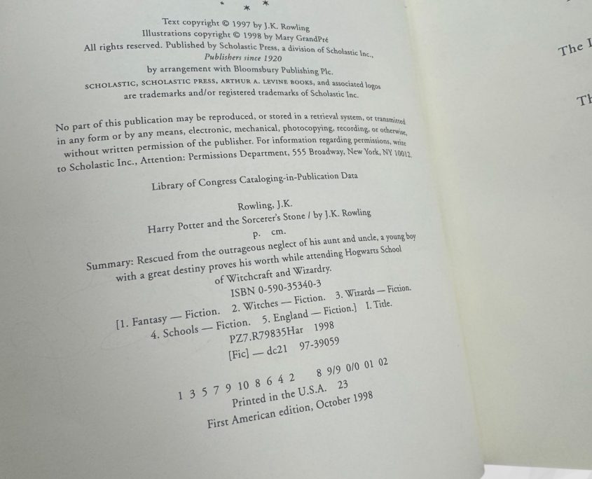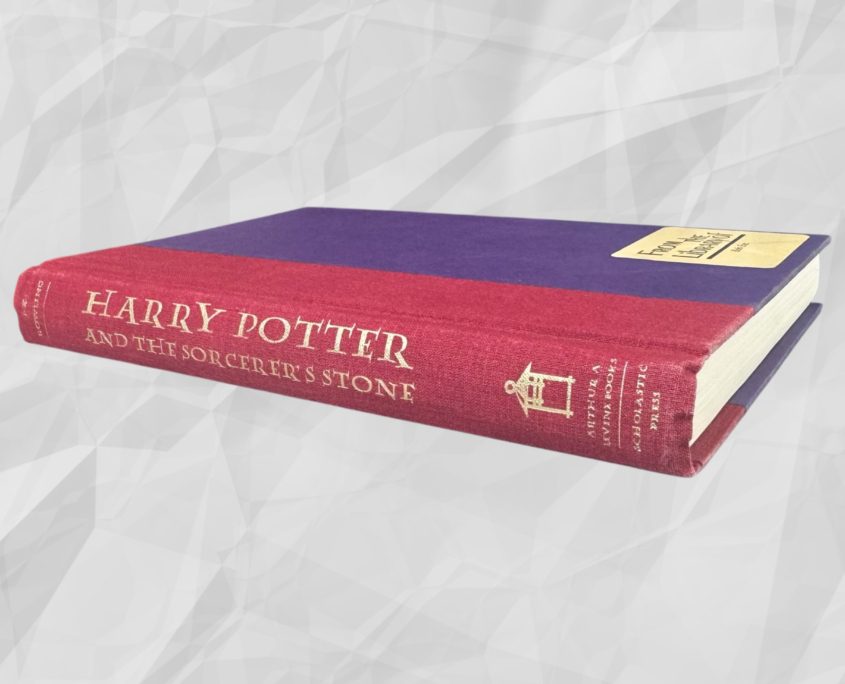 This is a beautiful copy of the first US edition with all of the important true first printing points present: The book has a red spine with purple boards, which says J.K. Rowling not just Rowling at the top, it has the numberline 1 3 5 7 9 10 8 6 4 2 and states that it is printed in the U.S.A. The dust jacket is the first state dust jacket whereby the title has raised gold letters, the spine does not have the number 1 on it and will show a quote on the rear of the jacket from The Guardian, not Publisher’s weekly. It will also have the correct price of $16.95 on the inner front flap.