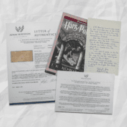 This signature and inscription come fully authenticated by Adam Houston ‘theHarryPotterspecialist’ the world’s leading expert in authenticating Jo’s signature. It comes with a full authentication package including a letter of authenticity, collector card and provenance.