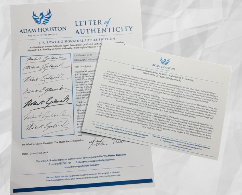 Taken together, this is an exceptionally rare opportunity to acquire a complete, fully authenticated set of all eight Cormoran Strike novels in first edition, first printing state, each signed by J.K. Rowling and supported by strong provenance. In a market increasingly affected by forgery, such a comprehensive and carefully documented set represents both a significant collector’s piece and a sound long-term investment.