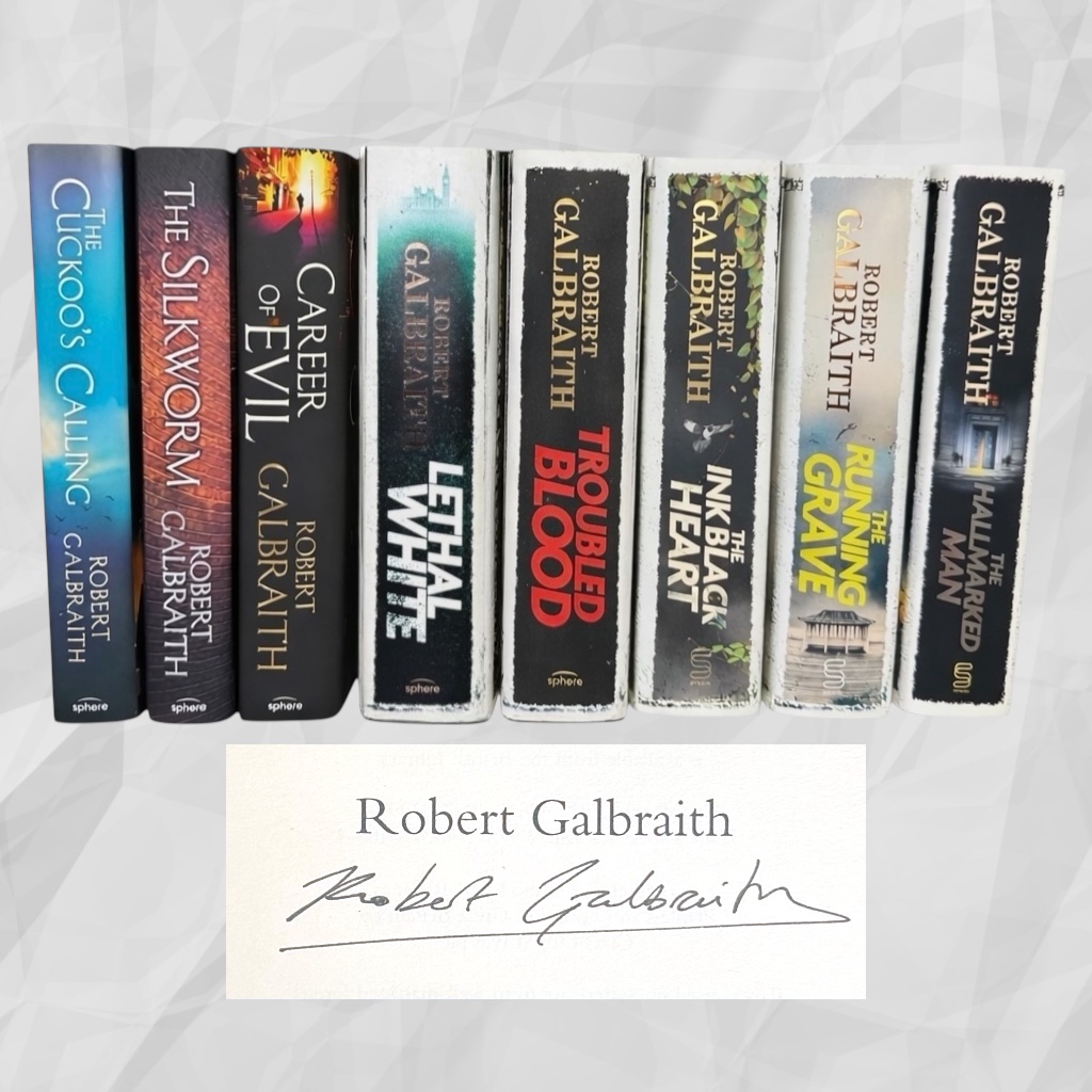 A fine condition, complete first edition, first printing set of all eight Robert Galbraith (J.K. Rowling) Cormoran Strike novels, each authentically signed by J.K. Rowling and fully authenticated by Adam Houston, widely known as “the Harry Potter specialist” and regarded as the leading authority on J.K. Rowling’s signature. The first six volumes were meticulously acquired by Adam Houston in 2023, while volumes seven and eight were purchased directly from their original owners shortly after publication. The set is accompanied by a full authentication package including a Letter of Authenticity and collector card.